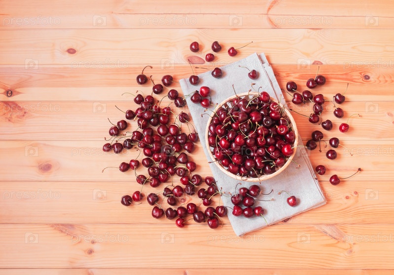 Вишни в плетеной корзине и рядом на деревянном столе