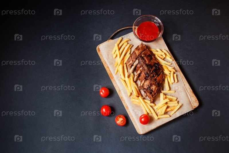 Запеченные свиные ребрышки с картофелем фри. Вид сверху, пространство для копирования