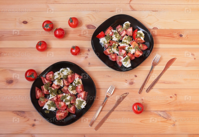 Салат капрезе со спелыми помидорами, сыром моцарелла и соусом песто на деревянном столе. Вид сверху