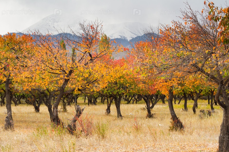 Абрикосовый сад с красочными желтыми, оранжевыми и красными листьями осенью