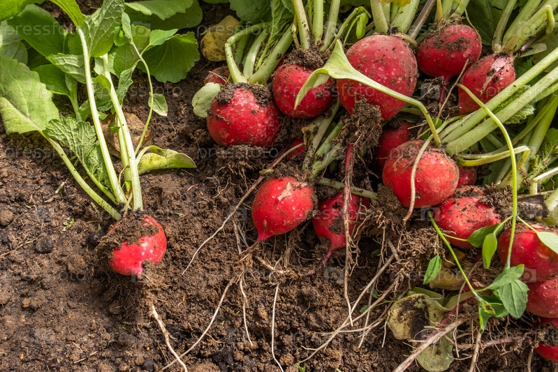 Собранный урожай редиски лежит на грядке, концепция здорового питания