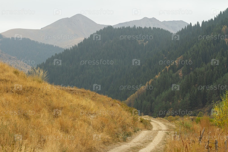 Пустынная пыльная проселочная дорога возле осенних гор, концепция путешествия