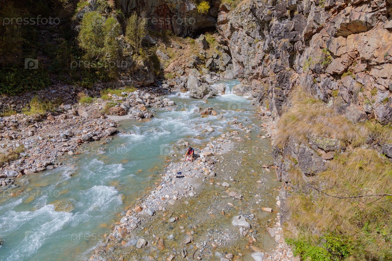 Мужчина-турист сидит у реки в горах. Поход в горы