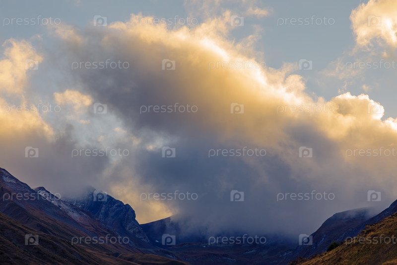 Высокогорья Северной Осетии. Горы Кавказа. Высокие горы в лучах заходящего солнца