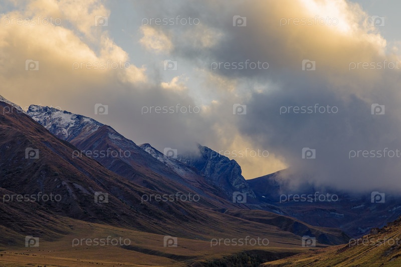 Высокогорья Северной Осетии. Горы Кавказа. Высокие горы в лучах заходящего солнца