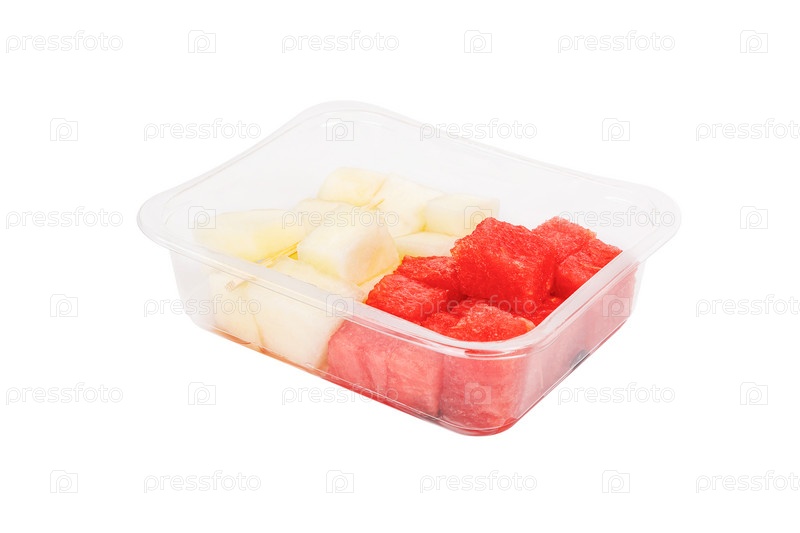 Фруктовый салат с арбузом и дыней в пластиковом контейнере на белом фоне. Фото высокого качества
