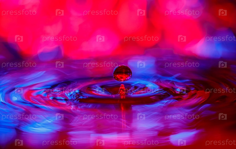 В воду падает прозрачная капля с красно-фиолетовым фоном. Абстрактный красочный фон