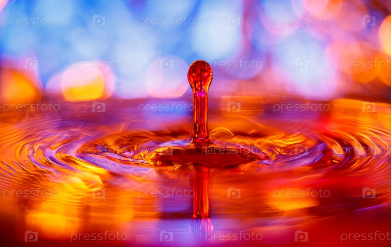В воду падает прозрачная капля с красно-желтым фоном. Абстрактный красочный фон