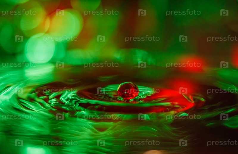 В воду падает прозрачная капля с зеленым фоном. Абстрактный красочный фон