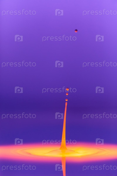 Капля попадает в густую жидкость с фиолетово-желтым фоном. Абстрактный красочный фон
