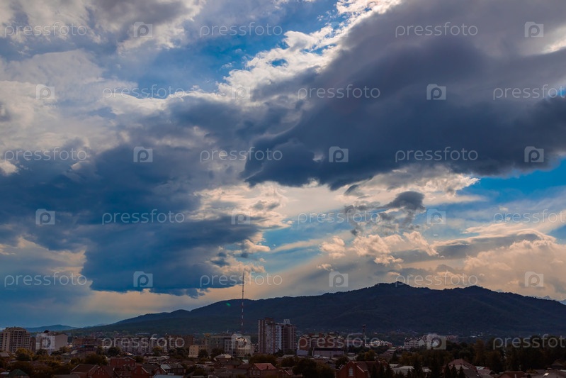 Панорама горного Владикавказа в Северной Осетии. Темные тучи над городом