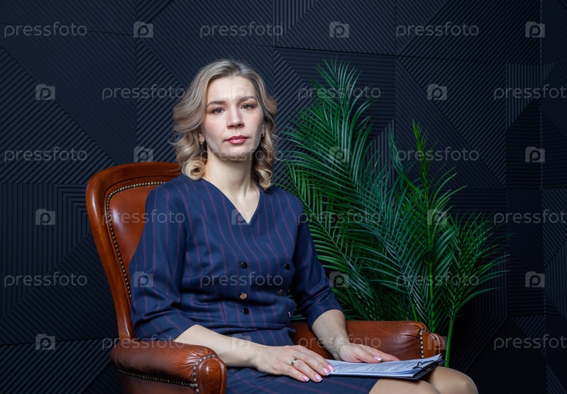 Портрет успешной женщины-психолога в ее кабинете, с блокнотом в руке, в кресле