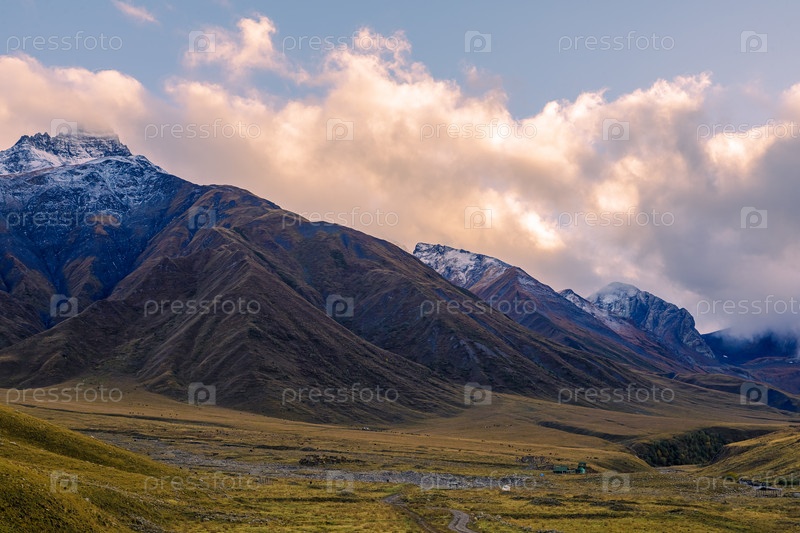 Высокогорья Северной Осетии. Горы Кавказа. Высокие горы в лучах заходящего солнца