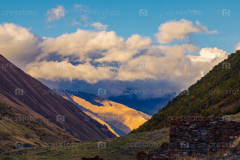 Высокогорья Северной Осетии. Горы Кавказа. Высокие горы в лучах заходящего солнца