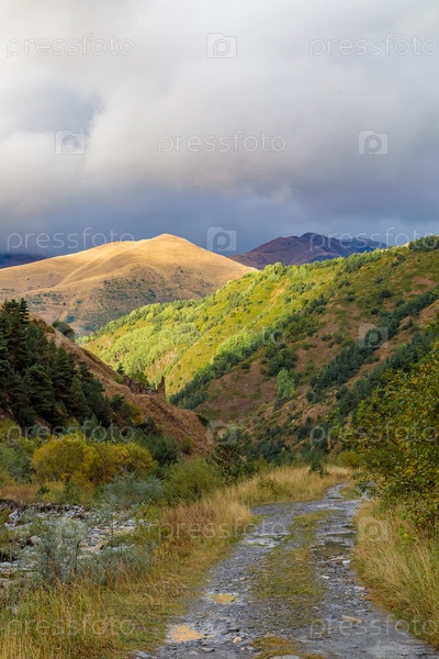 Высокогорья Северной Осетии. Горы Кавказа. Высокие горы в лучах заходящего солнца