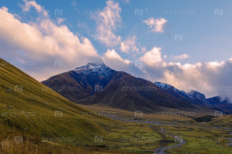 Высокогорья Северной Осетии. Горы Кавказа. Высокие горы в лучах заходящего солнца