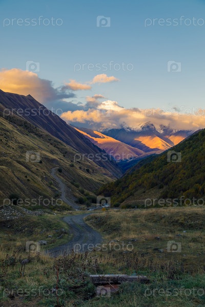 Высокогорья Северной Осетии. Горы Кавказа. Высокие горы в лучах заходящего солнца