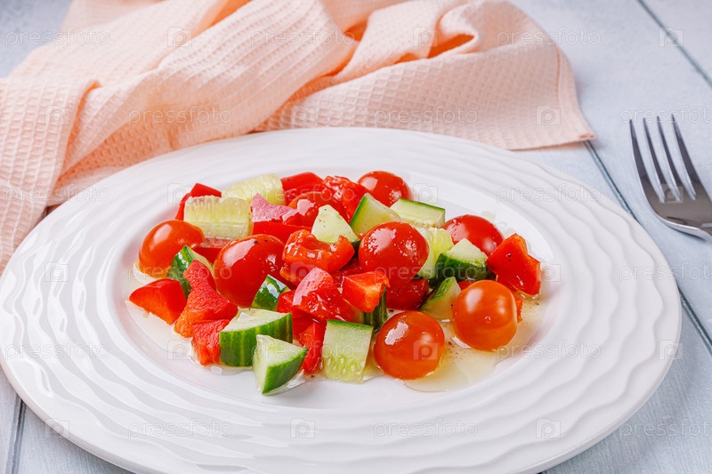 Салат из огурцов, помидоров черри, перца и заправки в тарелке на белом деревянном фоне