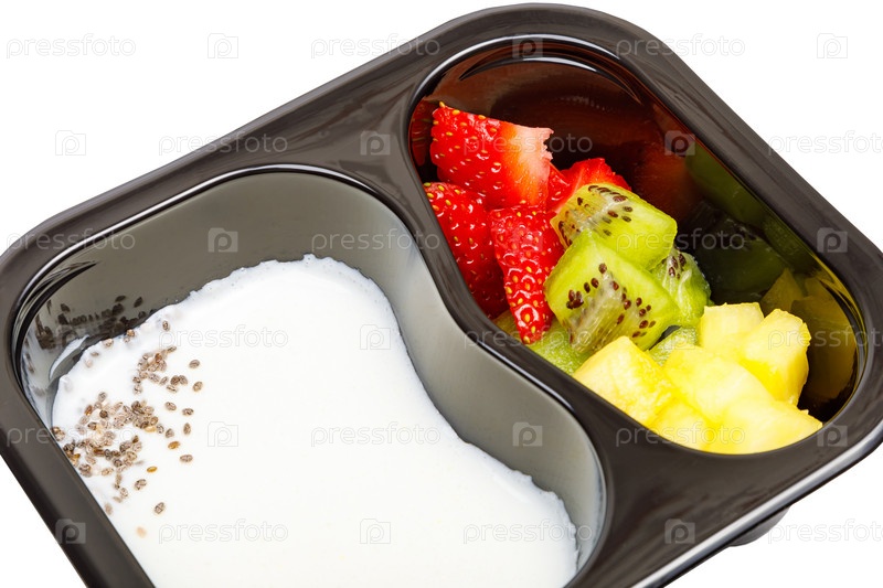 Порция йогуртового десерта с клубникой, киви и ананасом в пластиковой миске. Фото высокого качества