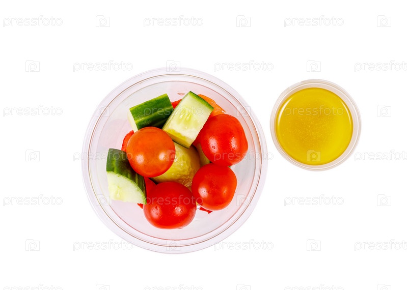 Салат из огурцов, помидоров черри, перца и заправки на белом фоне. Вид сверху. Изолированный