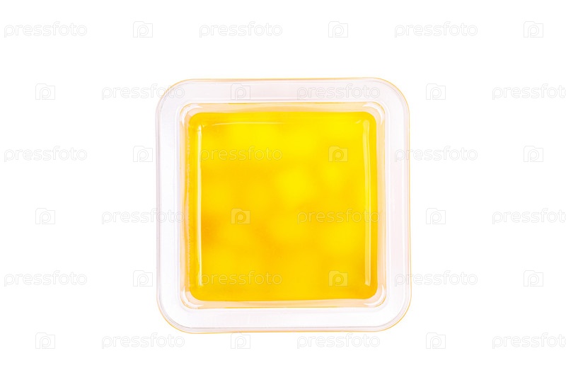 Желе из грейпфрута, манго и малины в пластиковой чашке на белом фоне. Вид сверху