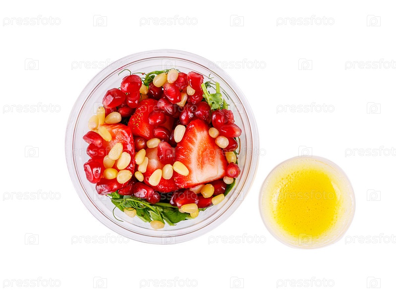 Салат с микрозеленью, клубникой, кедровыми орешками и зернами граната. Отдельный на белом фоне. Вид сверху