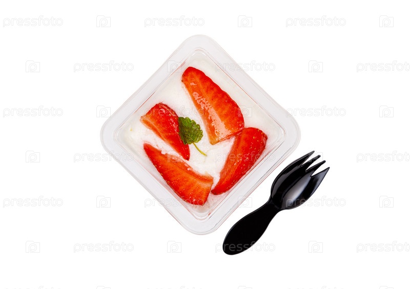 Десерт из белого и розового крема с клубникой в пластиковом контейнере на белом фоне