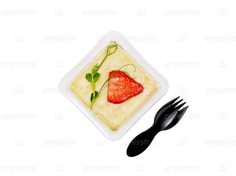 Сладкий десерт из сливок, джема, мюсли и клубники на белом фоне