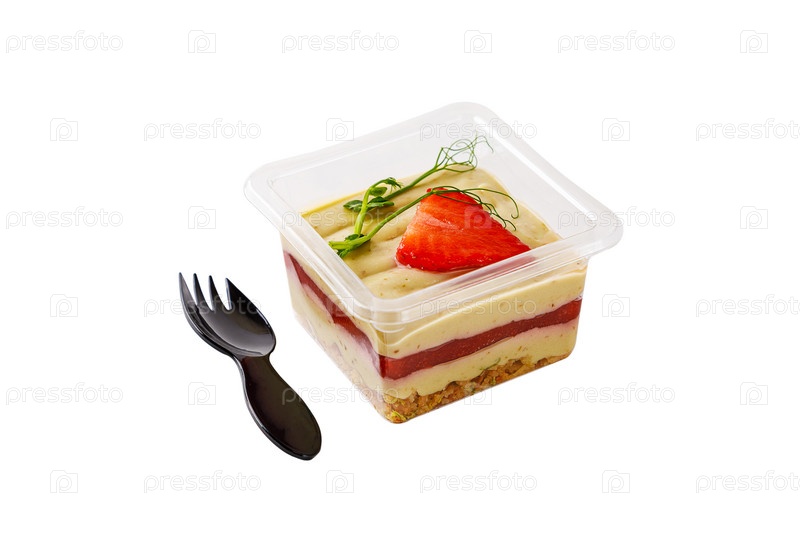 Сладкий десерт из сливок, джема, мюсли и клубники на белом фоне. Фото высокого качества