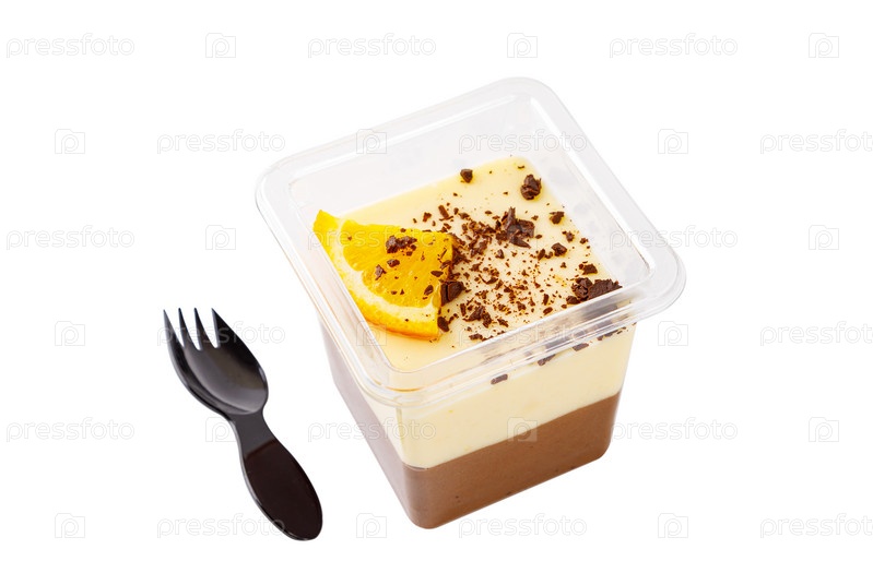 Десерт тирамису в пластиковой коробке с вилкой на белом фоне