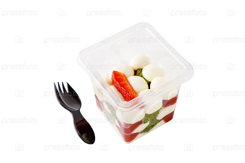 Десерт из сливок, шпината, варенья и клубники в пластиковом стакане на белом фоне