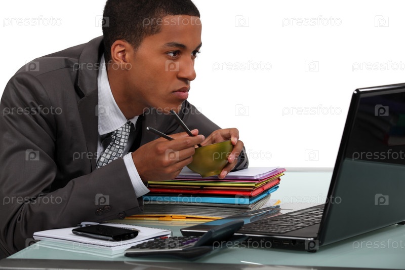 Мужчина ест китайскую еду за ноутбуком