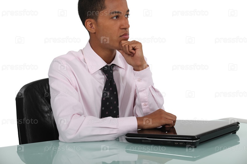Задумчивый бизнесмен опирается на закрытый ноутбук