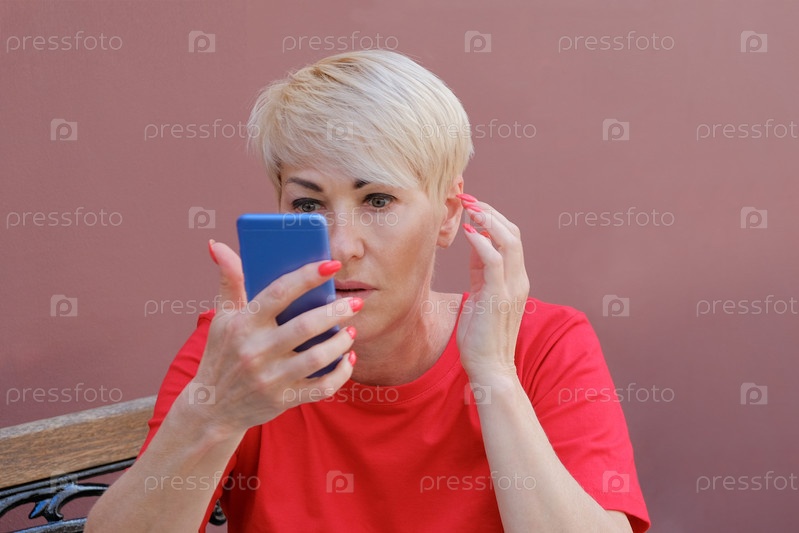 Женщина блондинка в красной футболке смотрит видео по мобильному телефону