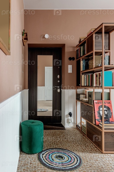 Прихожая в современной квартире выполнена в стиле ретро с книжными полками и зеленым пуфом и диваном
