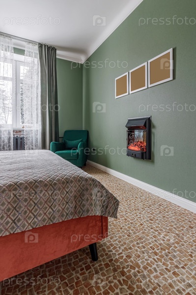 Спальня в стиле ретро с кроватью, старым шкафом и зелеными стенами