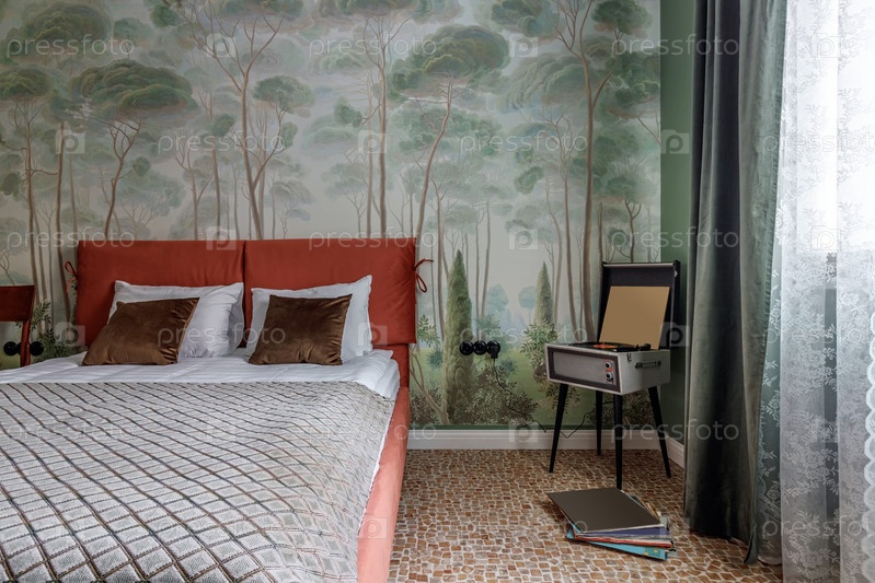 Спальня в стиле ретро с кроватью, старым шкафом и зелеными стенами