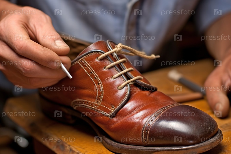 Сапожник ремонтирует обувь в мастерской. Крупный план. Генеративный ИИ. Иллюстрация высокого качества