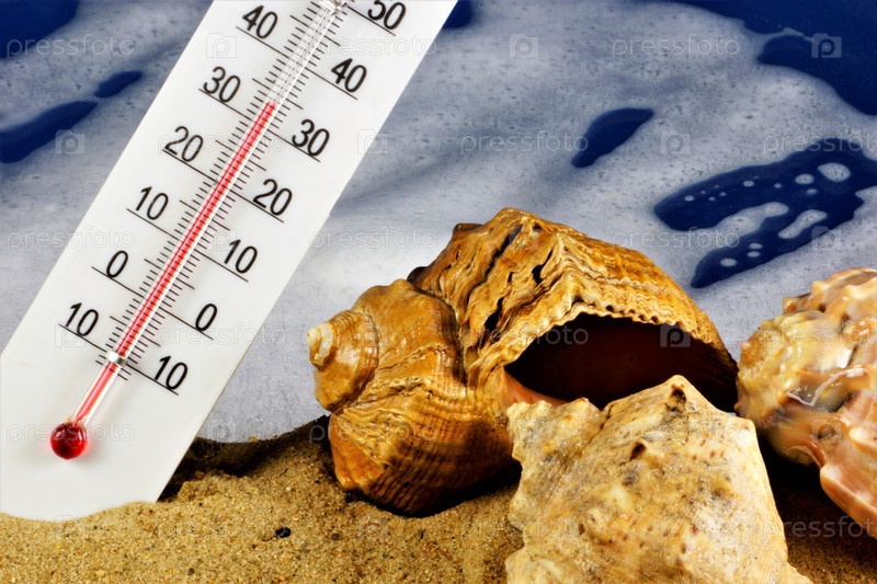 Термометр, ракушки на песке и пене. Термометр, теплый летний день на тропическом пляже, на фоне ракушек и пены. Горячая, высокая температура может быть замечена на термометре