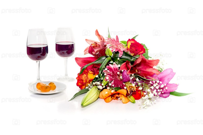 Букет разнообразных цветов, вина и кумквата крупным планом на белом фоне