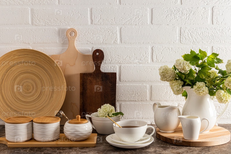 Красивый вид спереди на кухонную столешницу с современным дизайном, экологически чистой посудой и стильным декором. кирпичная стена