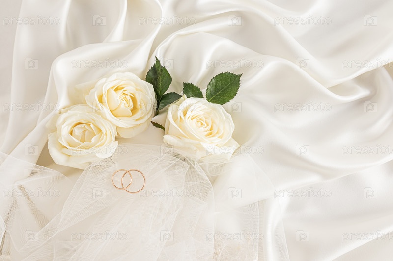 Два золотых обручальных кольца на бежевом атласном фоне с живыми чайными розами и частью фаты невесты. Шикарный макет для дизайна. Свадебный фон