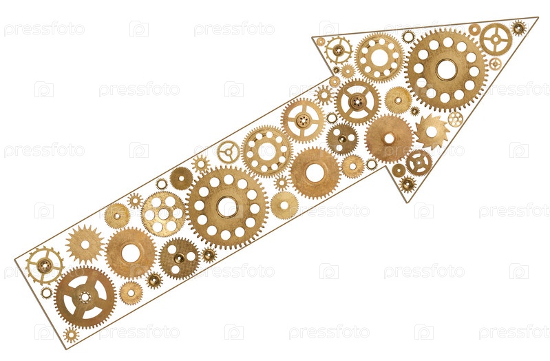 Металлические шестеренки в форме стрелы на белом фоне