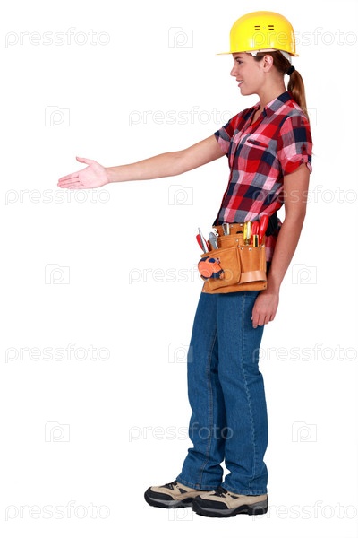 Женщина в защитной каске с инструментами протянула руку для рукопожатия