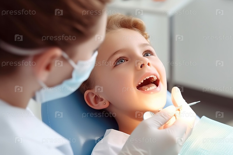 Женщина-стоматолог осматривает зубы ребенка в стоматологическом кабинете. Генеративный ИИ
