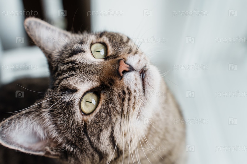 Милый кот. Домашняя кошка смотрит вверх. Портрет крупным планом. Фото высокого качества