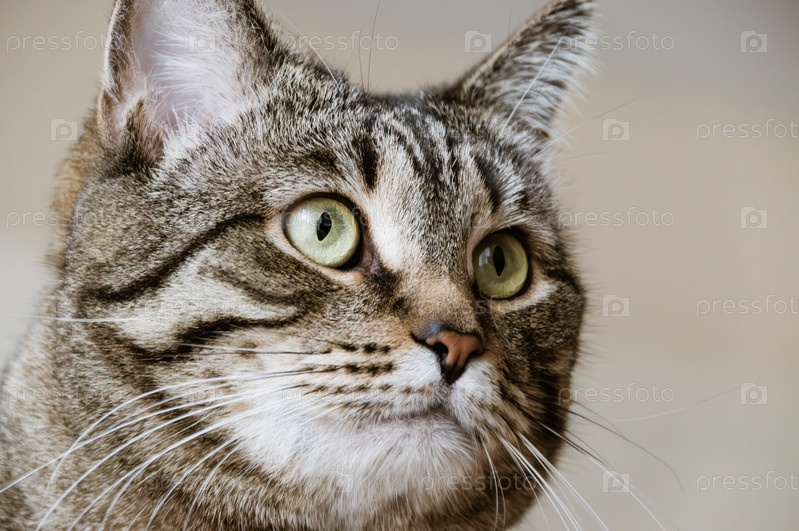 Милый питомец. Домашняя кошка смотрит вверх. Крупным планом портрет. Фото высокого качества