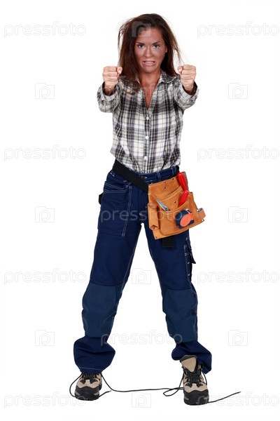 Обгоревшая женщина-строитель держит невидимый руль