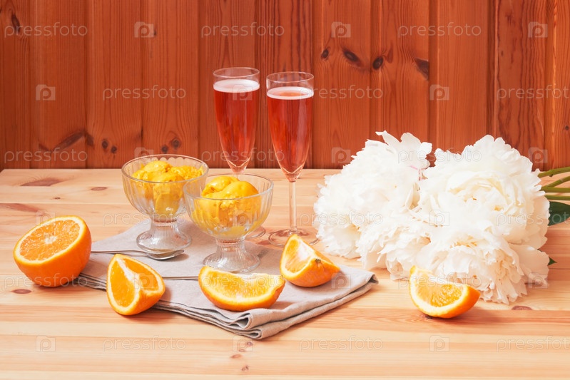 Бокалы розового шампанского, белые цветы пиона и миски апельсинового сорбетного мороженого на деревянном столе. Выборочный фокус