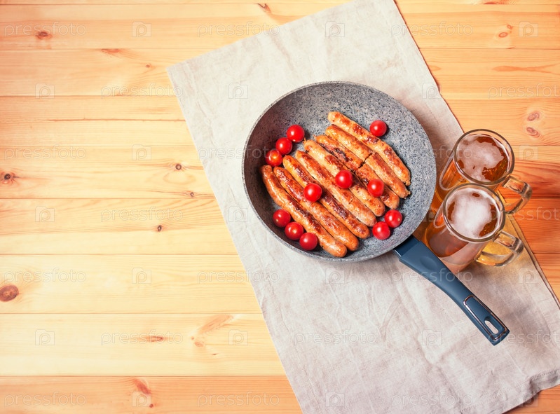 Жареные сосиски в сковороде и пивные кружки рядом на деревянном столе